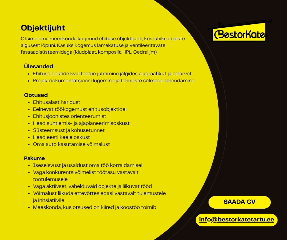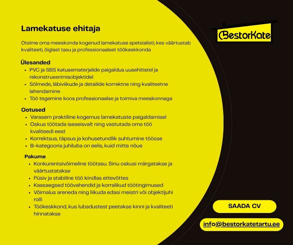Otsime Bestorkate Tartu tiimi võimekat Objektijuhti ja kogenud Lamekatuse ehitajat